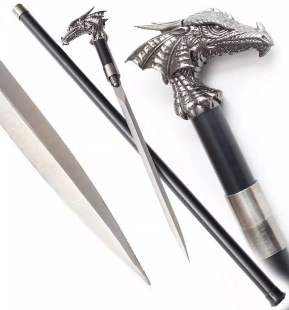 Superbe canne épée tout en métal, avec une tête de Dragon.