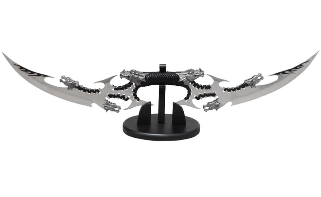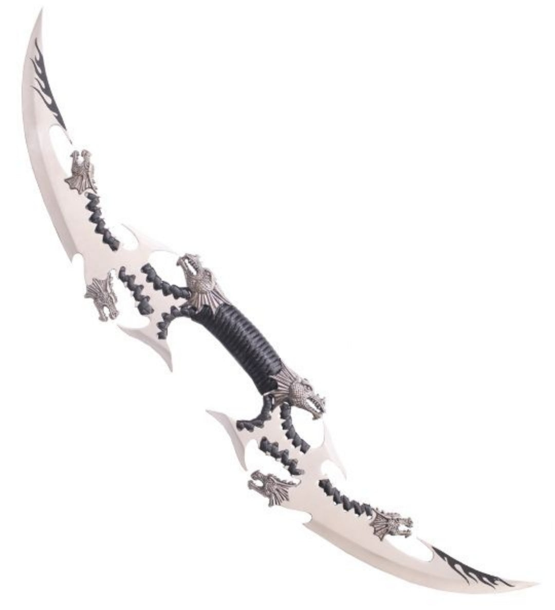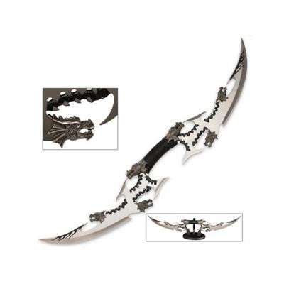Un véritable chef d'oeuvre de décoration, cette dague bilame est ornée de magnifiques têtes de dragon et de détails en coulures.