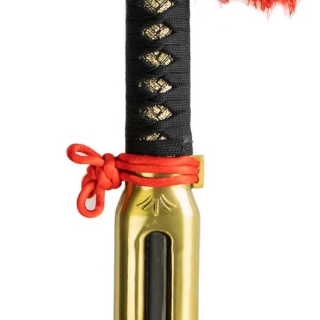 Kashira en métal doré oblique avec tresse de couleur rouge.