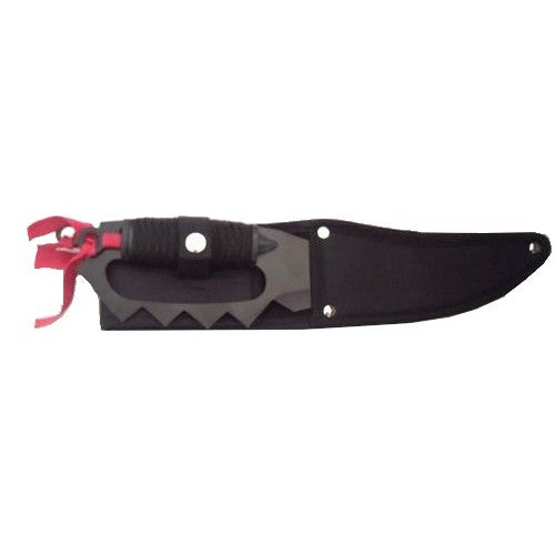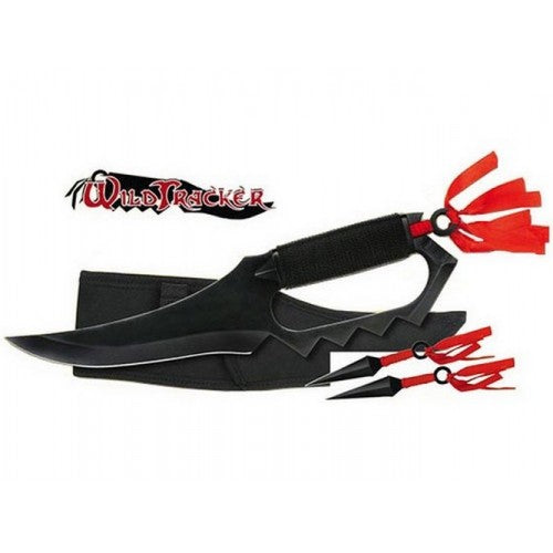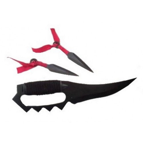 On peut voir sur le manche du couteau 2 petits kunaïs décorés de rubans rouges.